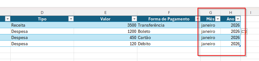 Agora sua base sabe exatamente em que mês e ano cada gasto ou receita aconteceu — isso será fundamental para gráficos e indicadores.
