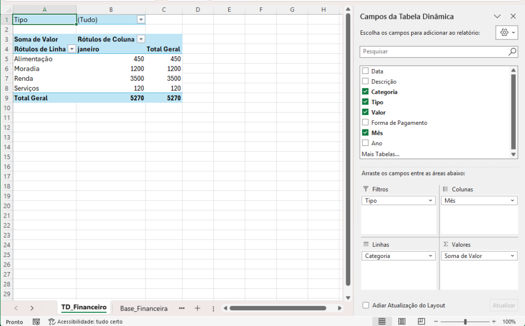Passo 8 – Criando a Tabela Dinâmica (o coração do Dashboard)